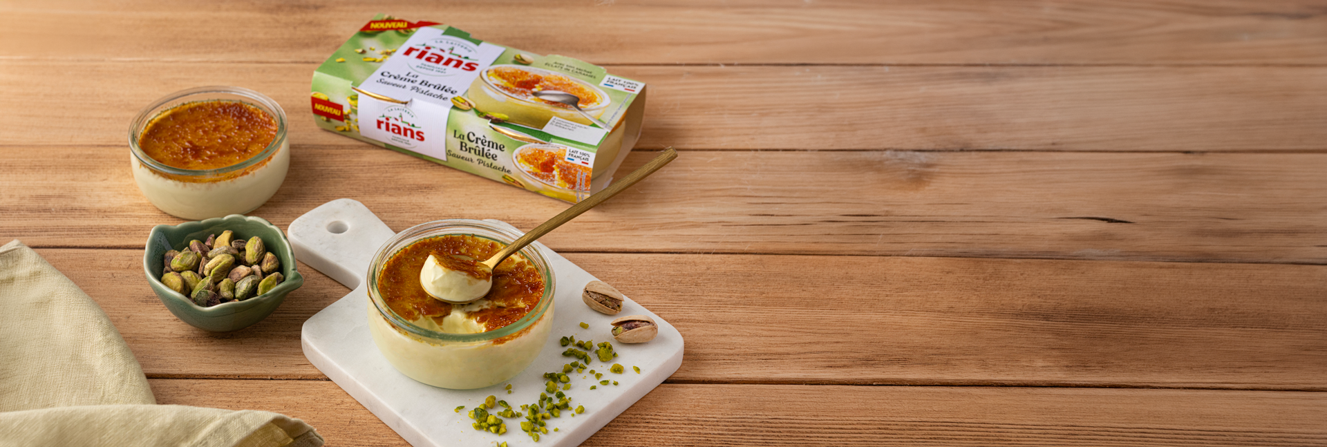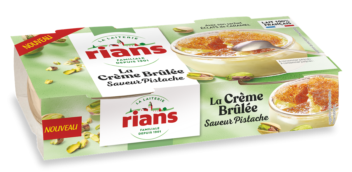 Une crème brûlée à la texture ferme, puis fondante en bouche avec notre signature de goût Rians unique : une pistache aux notes amandées, pralinées et intensément gourmandes.